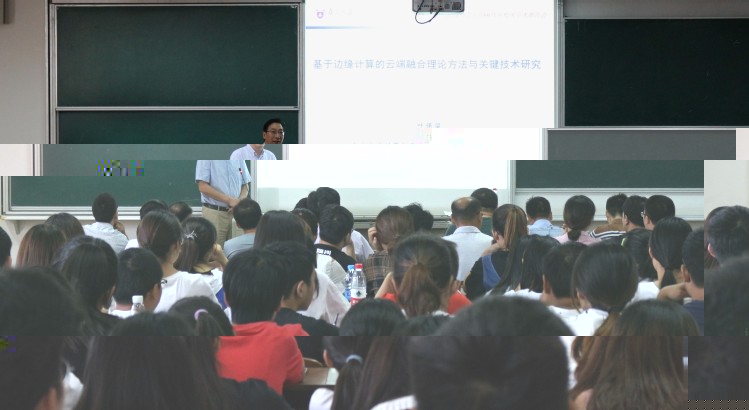 葉保留教授通過研究背景、技術現狀和研究方案三個方面向全體與會師生循序漸進地講述了他關于雲端融合的想法。他先由“雲計算”這一概念講起,娓娓道出雲計算逐漸跟不上近年來網絡的飛速發展,正面臨着“傳不暢、算不動、存不下”的巨大挑戰,再由此引出“雲端融合”這一理念。随後葉教授表示這一理念以“計算/數據協同遷移”為核心,使用“雲+網+端”雙向融合方式,并突破了以往的傳統,改“下行”為“上行”,從而使資源的分配更可控更合理。在近兩個小時的報告中,葉教授對當前計算機形勢的了解和深厚的專業底蘊讓師生們贊歎不已,并赢得了陣陣掌聲。