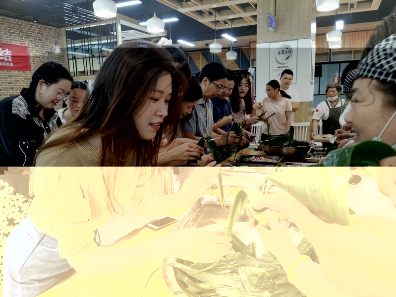 活動準備充分,師生們到達北苑食堂二樓時,食堂阿姨們已将粽子的餡料、蘆葦葉都已經準備好,空氣中彌漫着粽葉的淡淡香味。阿姨們給大家示範了不同地區的粽子裹法,各種形态的粽子激起了師生們動手實踐的欲望。大家相互學習,将蔥綠的粽葉從清水裡撈出相疊圈成小漏鬥,用顆粒飽滿的糯米填入其中,再加上鹹肉、蜜棗、花生等餡材,翻轉粽葉,穿上粽針,用麻線反複捆紮,忙的不亦樂乎,一個個有棱角、青油油的粽子在大家的手中快速完成。在煮粽子過程中,老師與少數民族同學們圍坐一起,深入了解了他們的生活情況和學習狀況,交談甚歡,構成了一幅和諧的畫面。整個活動在大家的歡聲笑語中落下帷幕。