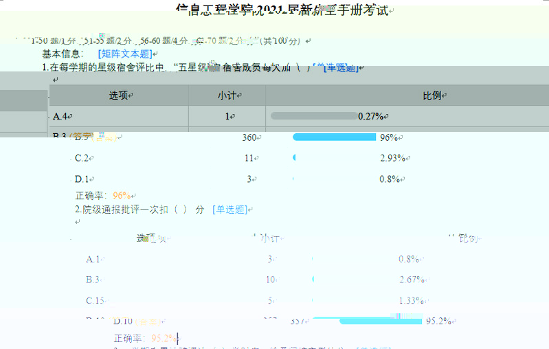 明制度,知章法,考試過程嚴謹規範。此次考試采取閉卷、線上問卷星限時答題模式,内容以我校《學生手冊》中的相關内容為基礎,涵蓋學籍管理、行為準則、素質綜合測評、獎學金評選、違紀處分、請假制度、宿舍管理、貧困生認定與資助等方面,以考促學,全面考核學生對校規校紀的認知程度。考試期間,同學們自覺遵守考試紀律,獨立思考,認真答卷,整體考風紀律良好。
