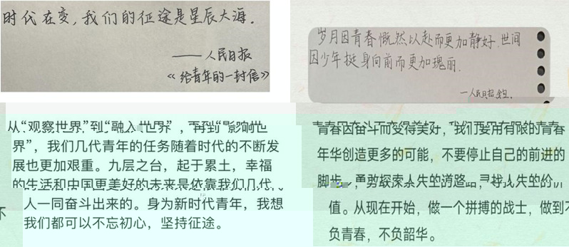 活動期間,同學們積極響應,踴躍參與,或以朗誦百年黨史、紅色經典、英雄故事的方式緻敬經典,傳遞榜樣力量;或指尖蹁跹,以溫暖的筆觸将自己閱讀的感受轉化成一篇篇真情實感的文章;或三天堅持閱讀,堅持摘抄,熱情分享自己的感想與感悟。活動結束時,共計收到作品九十餘份,這些作品以迎接和宣傳黨的二十大為主線,宣揚紅色文化,傳承紅色精神,踐行習近平總書記“以史為鏡、以史明志,知史愛黨、知史愛國”的理念,展示出青年一代堅定的理想信念和昂揚的精神面貌。