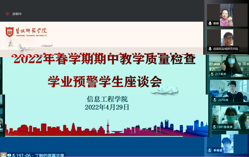為深入了解校園封閉管理中線上“教”與“學”情況,加強教學管理和學風建設,給及時調整和持續優化教學提供依據,4月29日晚,我院組織召開2022年春學期期中教學質量檢查學生座談會。普通學生代表、學業預警學生共66人分兩批參加會議,會議采取線上線下相結合的方式,黨委副書記姜琳出席會議。會議由值班輔導員薛殿春主持。