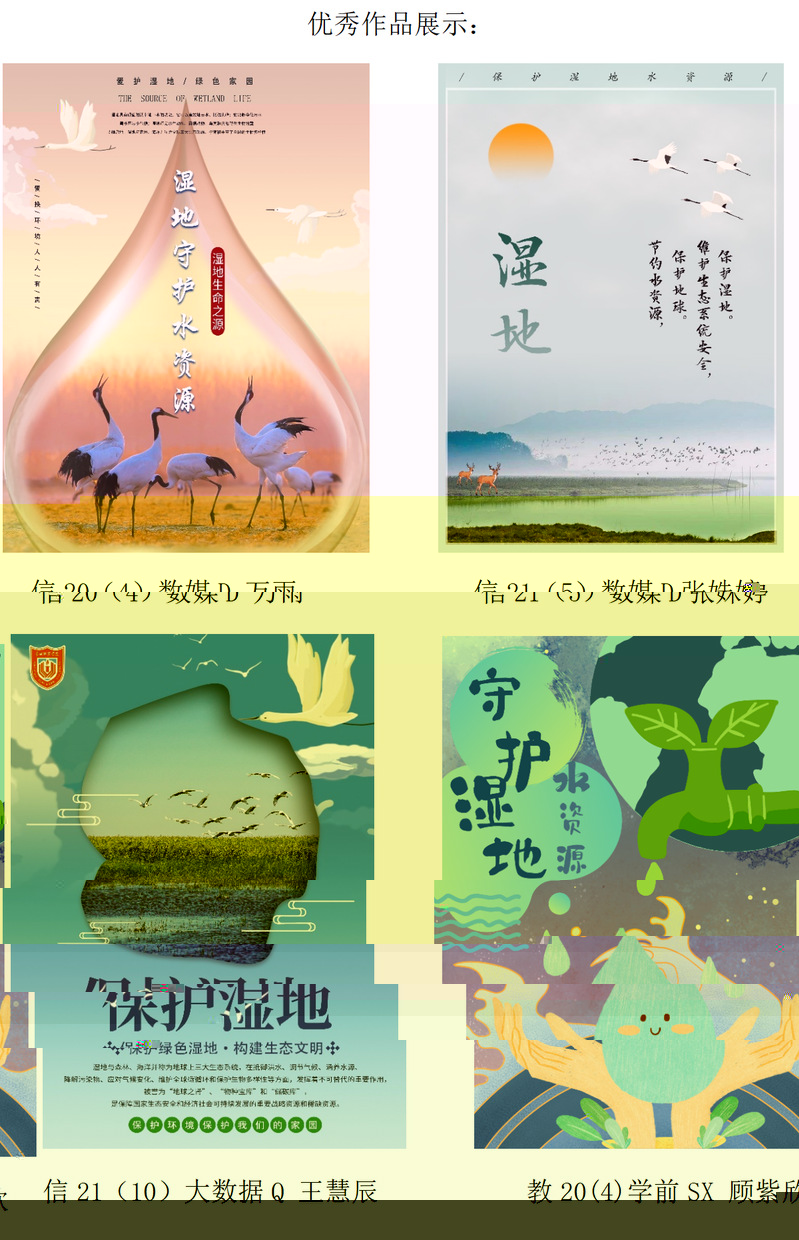 活動以主題海報、電子創意書簽兩種形式,将“濕地保護水資源”的理念融入專業創作中,引導青年大學生能夠胸懷天下,尊重自然,保護自然,推動濕地保護,為世界擔當,為地球擔責。活動中,同學們展開豐富的想象力與創造力,以濕地自然風光為主體,結合宣傳标語,無聲地展現出濕地作為世界自然遺産的魅力,有力地傳達保護濕地環境、積極建設生态文明的信念。活動共計收到作品81份,作品緊扣主題、設計精巧,起筆于濕地大美的生态風景,落筆于濕地守護的重要意義。最終,活動評出特等獎作品6件,優勝獎作品9件。活動參與者,大數據2110班王慧辰表示:“參加這次活動我很開心,在制作海報的過程中,我深刻了解到濕地作為‘地球之腎’在調節大氣、淨化水質、調節徑流、保護生物多樣性等方面的重要作用,山水有禮,讓我們從小事做起,一起做濕地文明的‘守護者’,為建設濕地貢獻自己的力量。”
