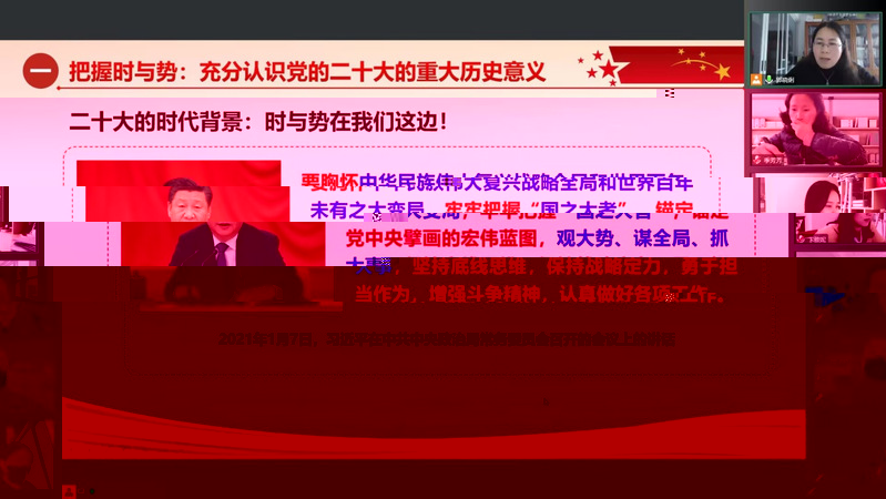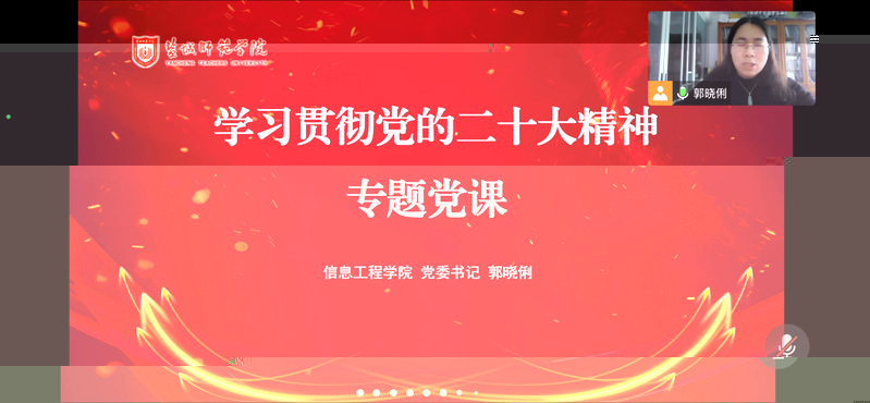 為深入學習宣傳貫徹黨的二十大精神,用黨的科學理論武裝青年,12月21日下午,信息工程學院學生黨支部舉辦《學習貫徹黨的二十大精神》專題黨課。學院黨委書記郭曉俐主講黨課,黨委副書記姜琳、學生第一、第二、第三黨支部書記、全體輔導員及學生黨員共計70人通過線上方式參加學習。