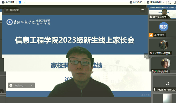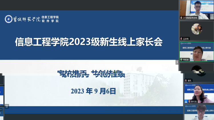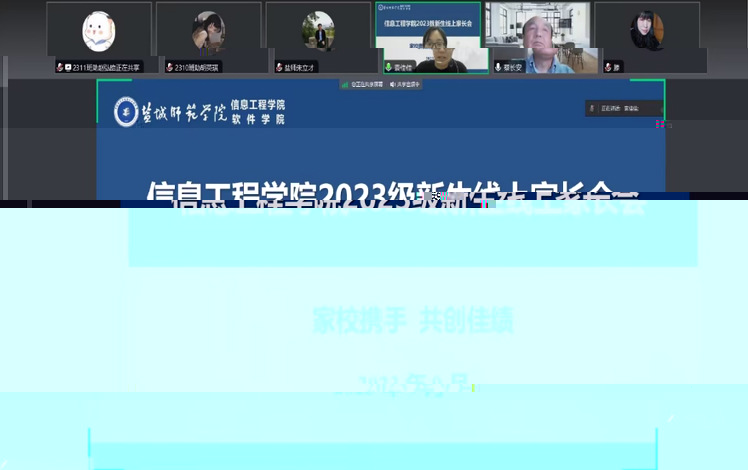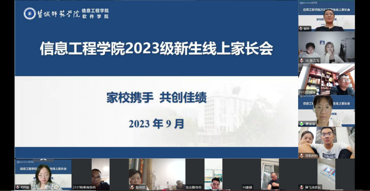 為形成目标同向、資源同聚、施教同心、經驗同享的育人格局,共同做好學院2023級新生的培養教育工作,9月6日晚,信息工程學院以“家校協手 共創佳績”為主題分專業系舉行了的2023級新生線上家長會。學院黨委書記郭曉俐、黨委副書記、院長朱立才、黨委副書記姜琳、副院長周彩根、各專業系主任、班主任參加會議。家長會由各專業系新生輔導員主持。