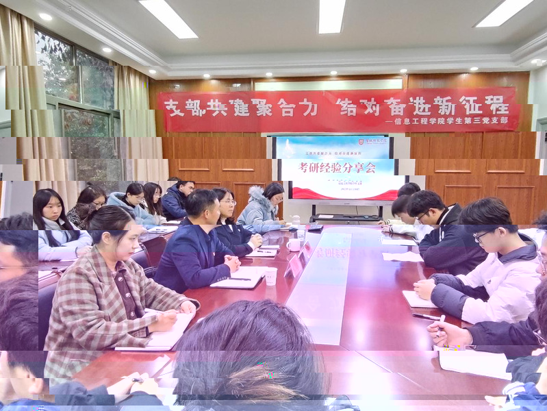 11月30日下午四點半,信息工程學院學生支部聯合研究生黨支部,于學院黨員之家召開考研經驗分享會。研究生處副處長、研究生黨支部書記趙友龍,學院黨委書記郭曉俐,學生黨支部書記以及20餘名學生代表參加會議,會議由毛阿璇主持。