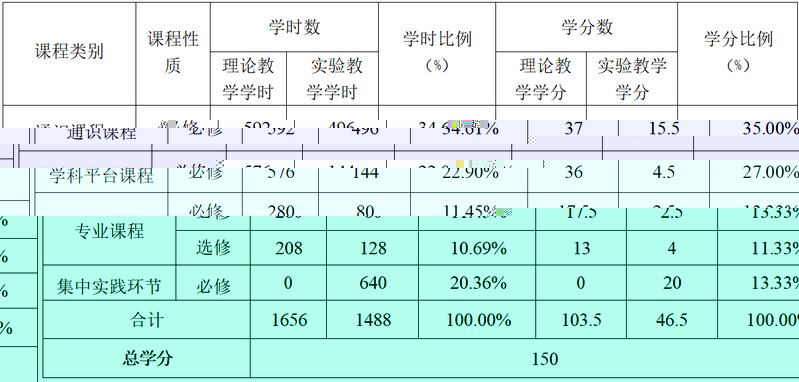 其中:理論教學1656學時、103.5學分,實驗教學1488學時、46.5學分,分别占總學時52.67%、47.33%,占總學分69.00%、31.00%。