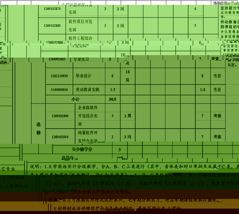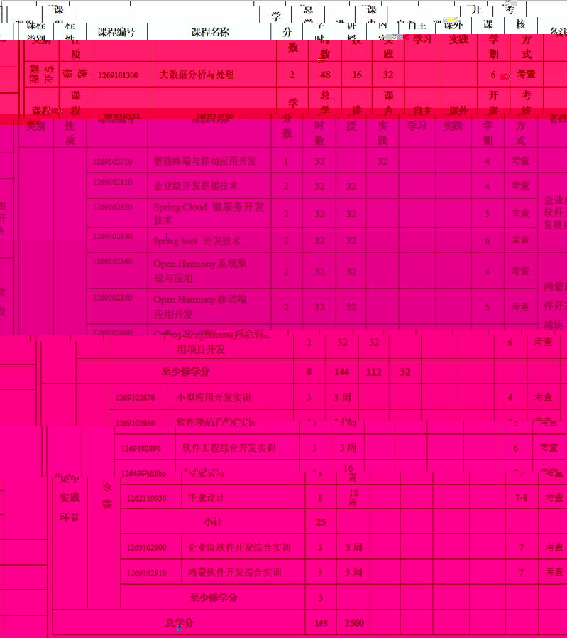 主要實踐環節:數據結構應用實踐、數據庫應用實踐、面向對象應用開發、小型應用開發實訓、企業級軟件開發綜合實訓、鴻蒙軟件開發綜合實訓、專業實習、畢業論文(設計)等。