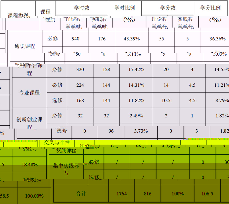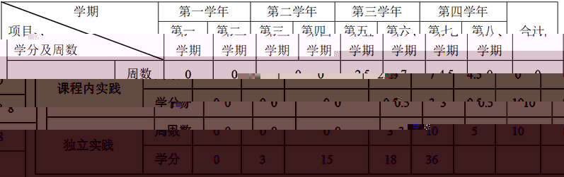 其中:理論教學1764 學時、106.5 學分,分别占總學時64.55%、占總學分61.21%,實踐教學816 學時、58.5學分,分别占總學時31.63%、占總學分35.45%。