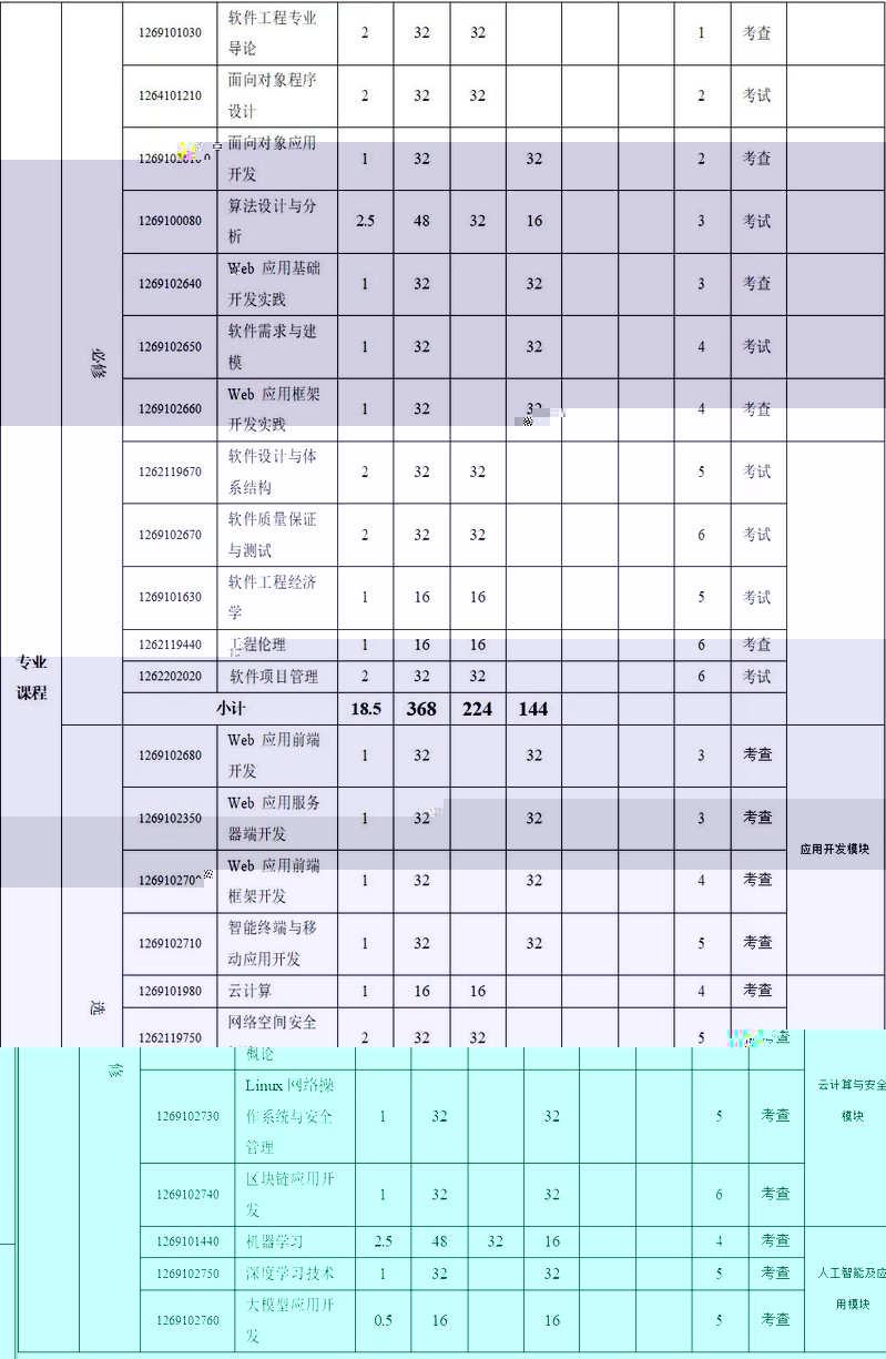 面向對象程序設計、數據庫原理與應用、計算機組成與結構、軟件需求與建模、軟件設計與體系結構、軟件質量保證與測試、軟件項目管理。