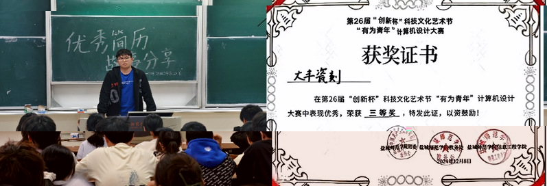 聚焦學科特色,班級打造“智創未來”成長平台。邀請榮獲省級及以上競賽獎項的學長分享“優秀簡曆故事”,從項目選題、算法優化到答辯技巧傾囊相授;持續開展“代碼馬拉松”實戰訓練,通過小組協作攻克編程難題,參與全國計算機設計大賽、藍橋杯全國軟件和信息技術專業人才大賽、計算機大賽AIGC創新賽、中國國際“互聯網+”大學生創新創業大賽等,參與率達50%;學生馬蘇娴感慨:“從理論到實踐的閉環,讓我們真正體會到‘以賽促學’的力量”。