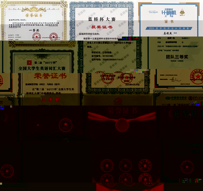 馬劍傑,男,中共預備黨員,鹽城師範學院信息工程學院軟件工程21(1)班學生,曾擔任評優部幹事和易班站務管理部幹事。曾榮獲第十五屆和第十六屆藍橋杯C/C++程序設計B組省級一等獎、第六屆傳智杯C/C++程序設計B組省級一等獎、中國高校計算機大賽——第七屆團體程序設計天梯賽省級三等獎、第五屆全國高校計算機能力挑戰賽C/C++程序設計省級三等獎、第二屆“BETT杯”全國大學生英語詞彙大賽省級三等獎、兩次一等獎學金、三次二等獎學金、校級優秀學生幹部、校級三好學生、畢業班三好學生。現以初試391分的成績成功考取南京信息工程大學軟件工程專業研究生。