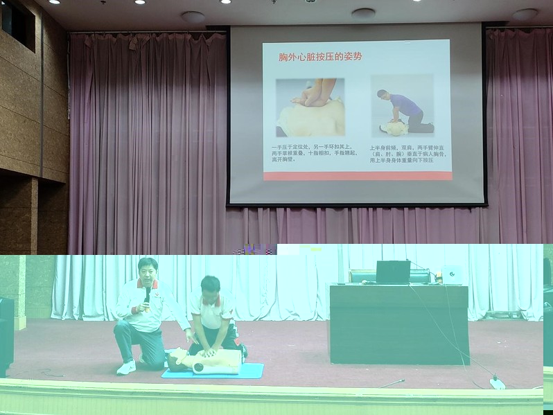 活動分兩階段。第一階段,市中心血站專家沈倩解析無償獻血知識,破除無償獻血誤區,指出定期獻血可激活造血功能、降低血栓風險,強調血站健康篩查嚴格,助師生建立科學認知。第二階段,紅十字會專家團隊以理論、演示、互動結合的方式開展急救實操培訓,重點教授心肺複蘇(CPR)和自動體外除顫儀(AED)使用,分解CPR步驟,強調 AED“聽它說、跟它做”原則,并全流程演示。通過培訓的師生将獲得由鹽城市紅十字會頒發的急救證書。