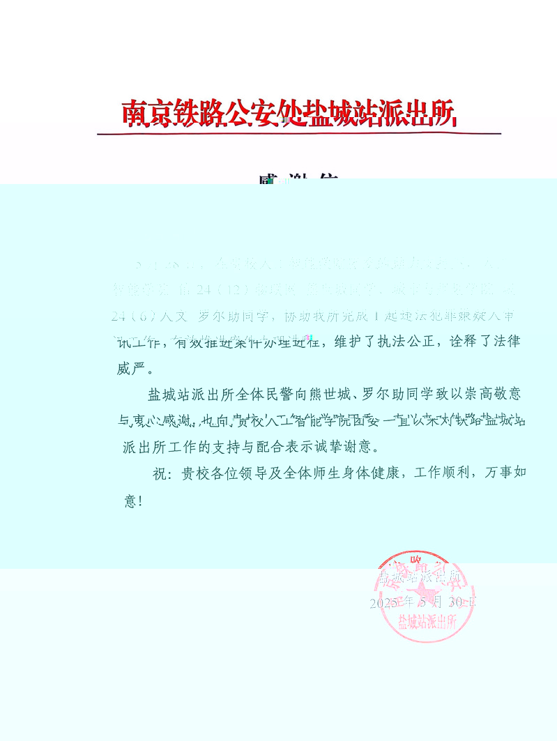 5月30日,人工智能學院信24(12)物聯網熊世城同學收到南京鐵路公安處鹽城站派出所的感謝信,感謝該同學在鹽城站協助派出所公安同志完成了1起違法犯罪嫌疑人審訊工作,有效推進案件辦理進程,維護了執法公正,诠釋了法律威嚴。感謝信中還特别對我校人工智能學院團委一直以來對鐵路鹽城站派出所工作的支持與配合表示誠摯謝意。